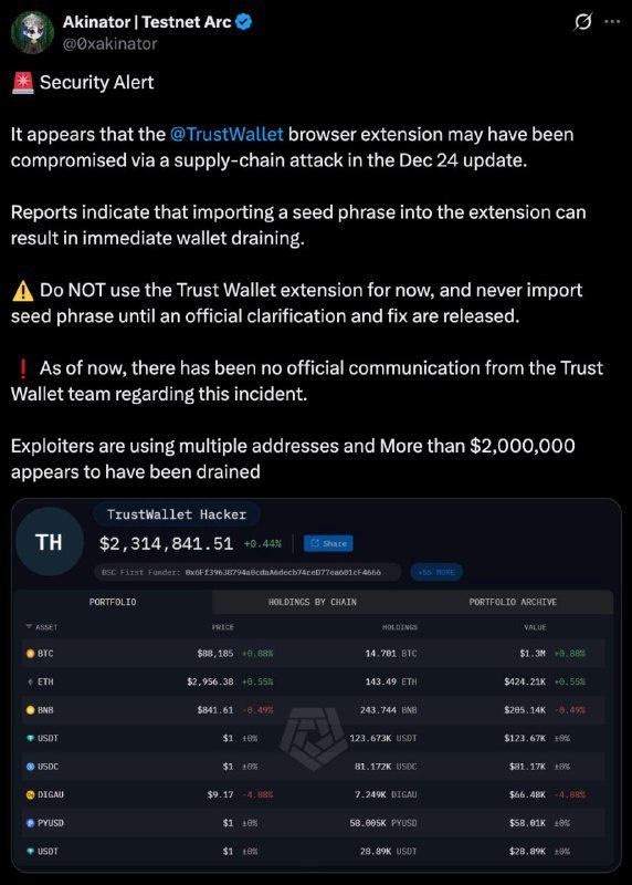 Видимо, криптокошелек стал жертвой хакерской атаки, в результате которой было украдено более 2 миллионов долларов. Проблема актуальна после установки браузерного расширения Trust. У некоторых пользователей без их ведома средства переводятся на неизвестные адреса. Утечка данных, вероятно, происходит при импорте сид-фразы в браузер. Поэтому владельцам криптовалюты в Trust Wallet настоятельно рекомендуется избегать использования данного расширения. Дополнительные подробности можно узнать в твитте. Постмейкер - автоматическое ведение канала 🤖 Анимация | СhatGPT-4 | Помощь с резюме