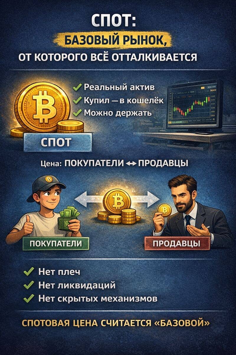 Спот — самый простой и интуитивно понятный инструмент. Что происходит на споте: ✅ ты покупаешь реальный актив ✅ он зачисляется тебе на баланс ✅ ты можешь держать его сколько угодно Цена формируется классически: • есть покупатели • есть продавцы цена — результат их сделок Важно: 🙅🏻♂️ нет плеч 🙅🏻♂️ нет ликвидаций 🙅🏻♂️ нет дополнительных механизмов 📌 Именно спотовая цена считается «базовой» для всего рынка. Но у спота есть ограничение: зарабатывать можно только на росте. Капитал работает медленно. Поэтому рынок придумал следующий инструмент… vkfinance.ru