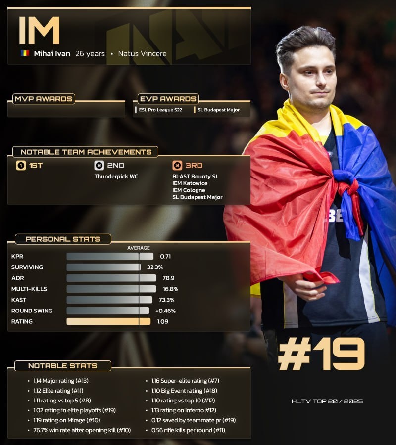 По итогам года киберспортсмен завершил сезон со средним индивидуальным рейтингом 1.09.