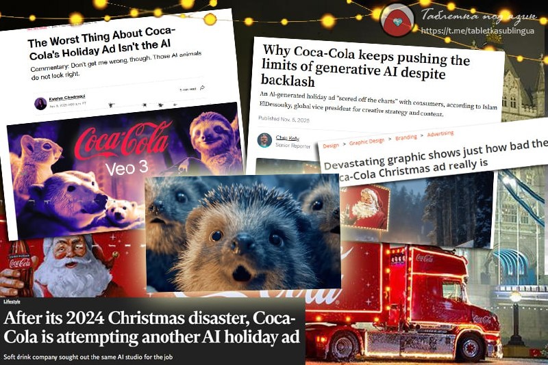 ? Ещё в прошлом году возмущённые покупатели обвинили компанию Coca-Cola в вытеснении художников и убийстве радостной рождественской эстетики из-за использования ИИ при воссоздании её культового рекламного ролика “Holidays are Coming”. И что компания сделала в этом году? Правильно! Кока-кола в этом году снова выпустила новогодний ролик, сгенерированный ИИ, причём с той же концепцией, созданной той же студией Secret Level. Несмотря на уверенность в том, что в этом-то году всё будет иначе, реклама уже огребла по полной получила негативную реакцию от зрителей. 🤩🤩 🤩🤩Рекламный ролик простой. Грузовик Coca-Cola проезжает по зимнему пейзажу и попадает в заснеженный город, а лесные звери просыпаются и следуют за грузовиком к зажжённой рождественской ёлке на городской площади. 🤨 Зрители заметили, что грузовики меняют форму от кадра к кадру, колёса появляются и исчезают, а антропоморфные животные двигаются неестественно. Комментаторы называют результат бездушным, жутким и призывают к бой