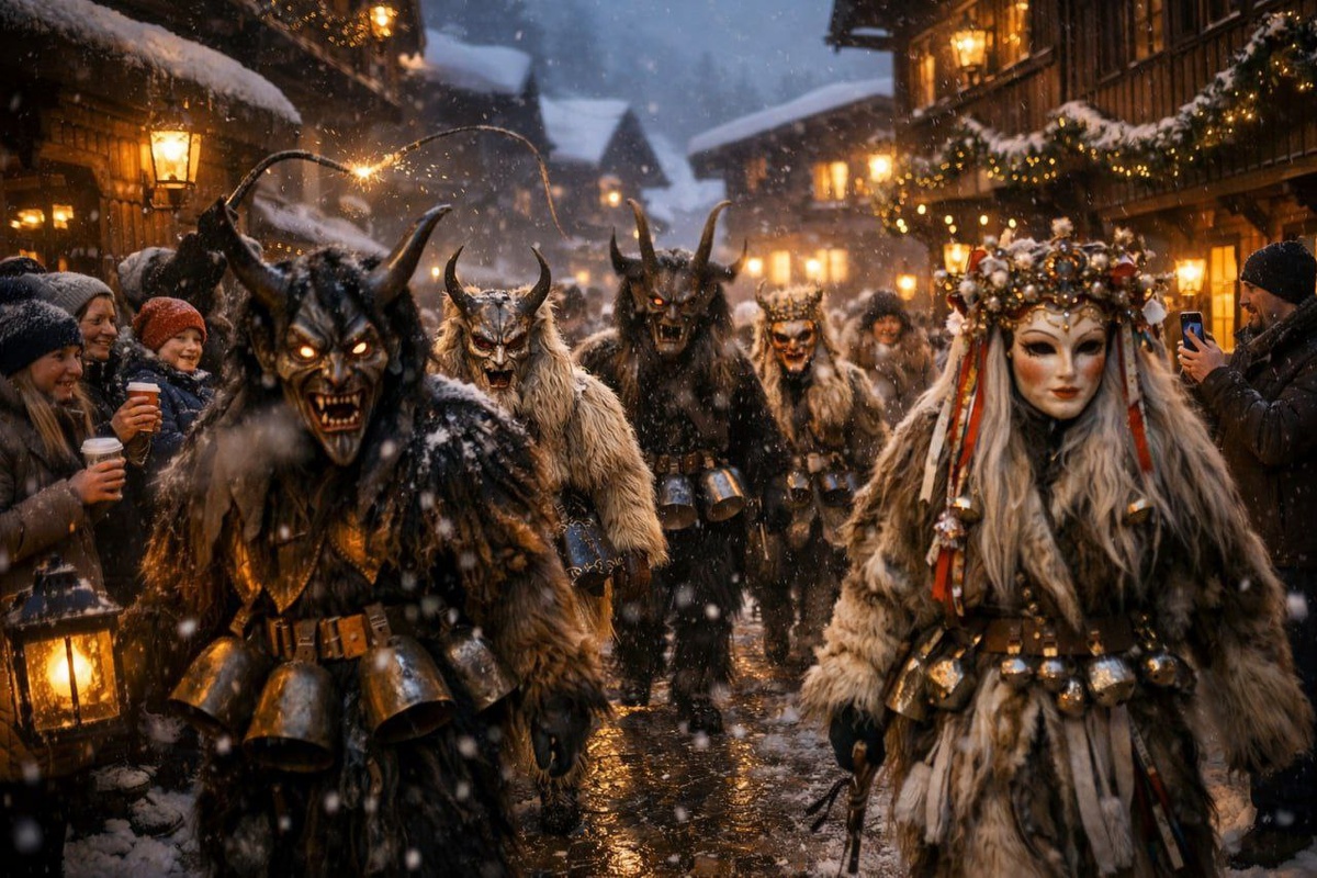 Представь вечер в маленьком альпийском городке. Снег, дым из труб, тёплый свет из окон. И тут из темноты выходит процессия: