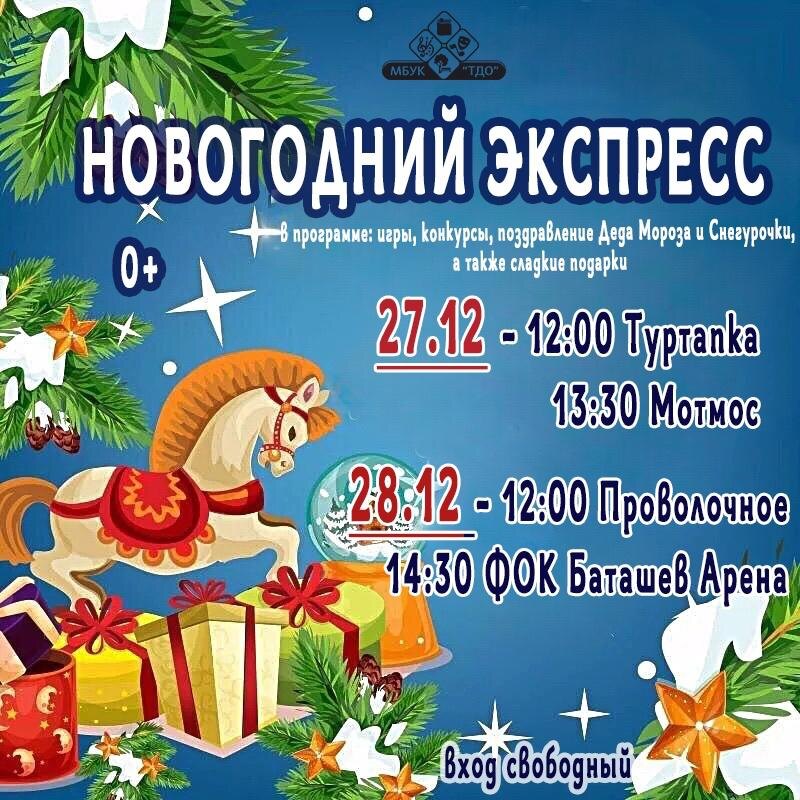 » Вместе с героями все присутствующие окажутся в волшебной сказке, вылечат Бабу Ягу, помогут Деду Морозу выбраться из заколдованного леса и встретят символ Нового года — веселую лошадку! 🐴 Маршрут экспресса: 🌀 27 декабря 12:00 — п. Туртапка (площадка перед зданием администрации) 13:30 — м-он Мотмос (район дома №9) 🌀 28 декабря 12:00 — п. Виля (бывший п. Проволочное, район ул. Московская) 14:30 — ФОК «Баташев Арена»