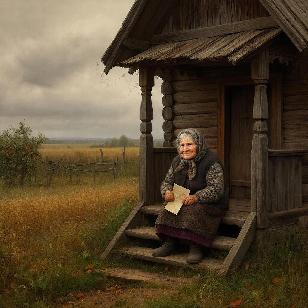 Бабушка Прасковья сидела на заваленке своего старого дома, положив на колени жилистые руки. Солнце клонилось к закату, окрашивая небо в цвета увядающей осени — багрянец, охру, бледное золото. Такой же закат она видела в тот день, когда провожала на войну старшего сына, Федора.