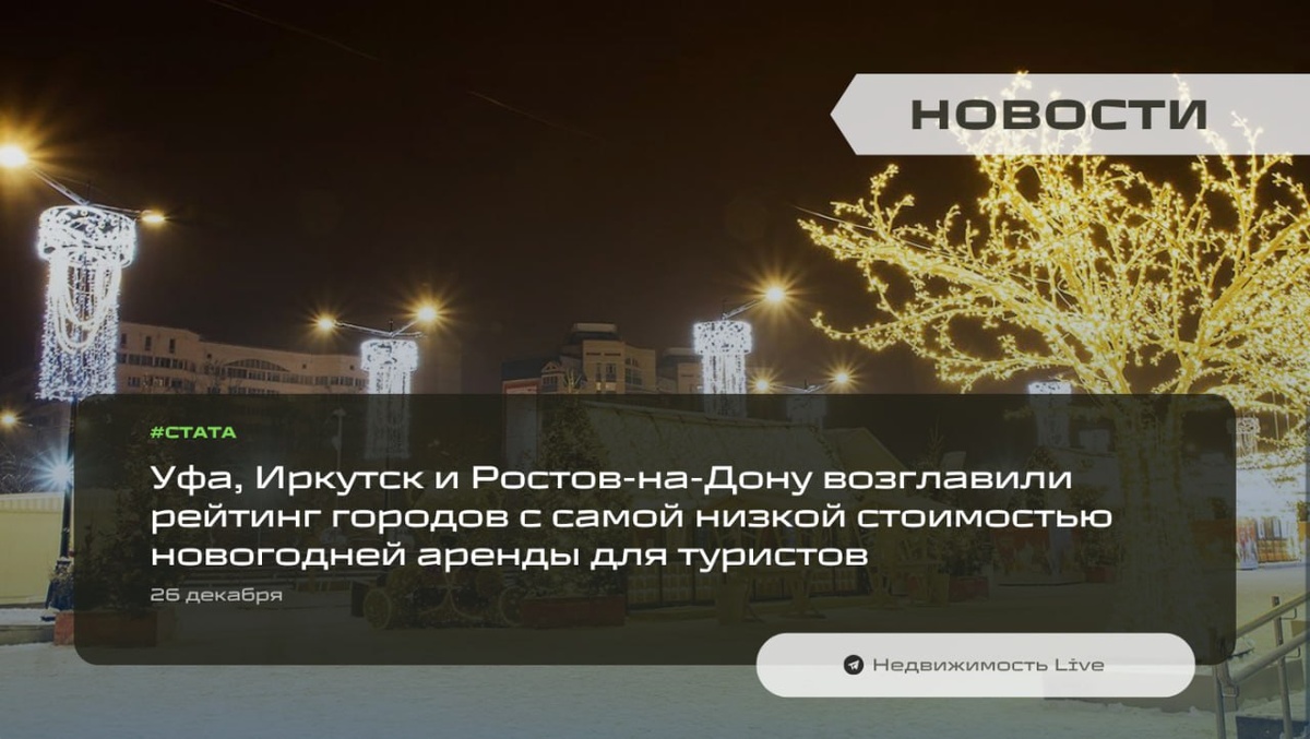 ⚡️ Уфа, Иркутск и Ростов-на-Дону возглавили рейтинг городов с самой низкой стоимостью новогодней аренды для туристов — средние ставки здесь