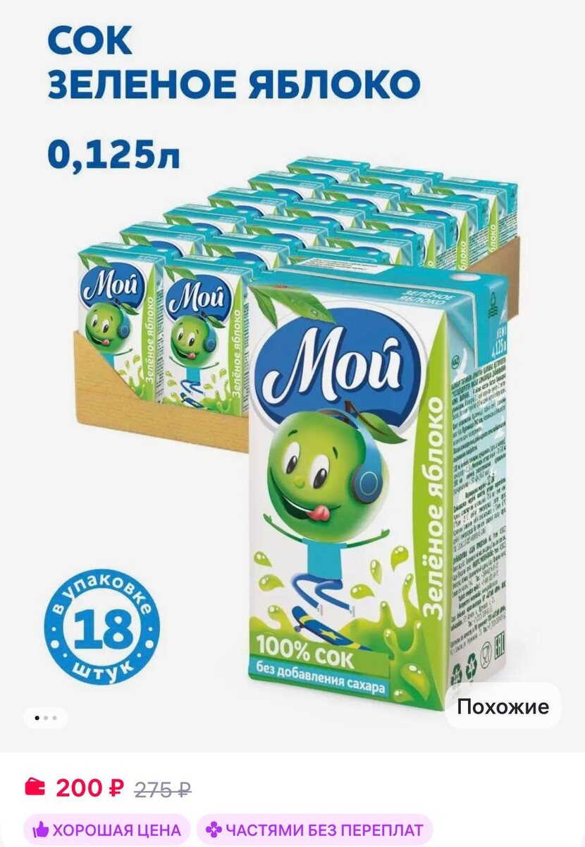 мой Сок яблочный из зеленых яблок осветленный 0,125л "Мой" 18 шт