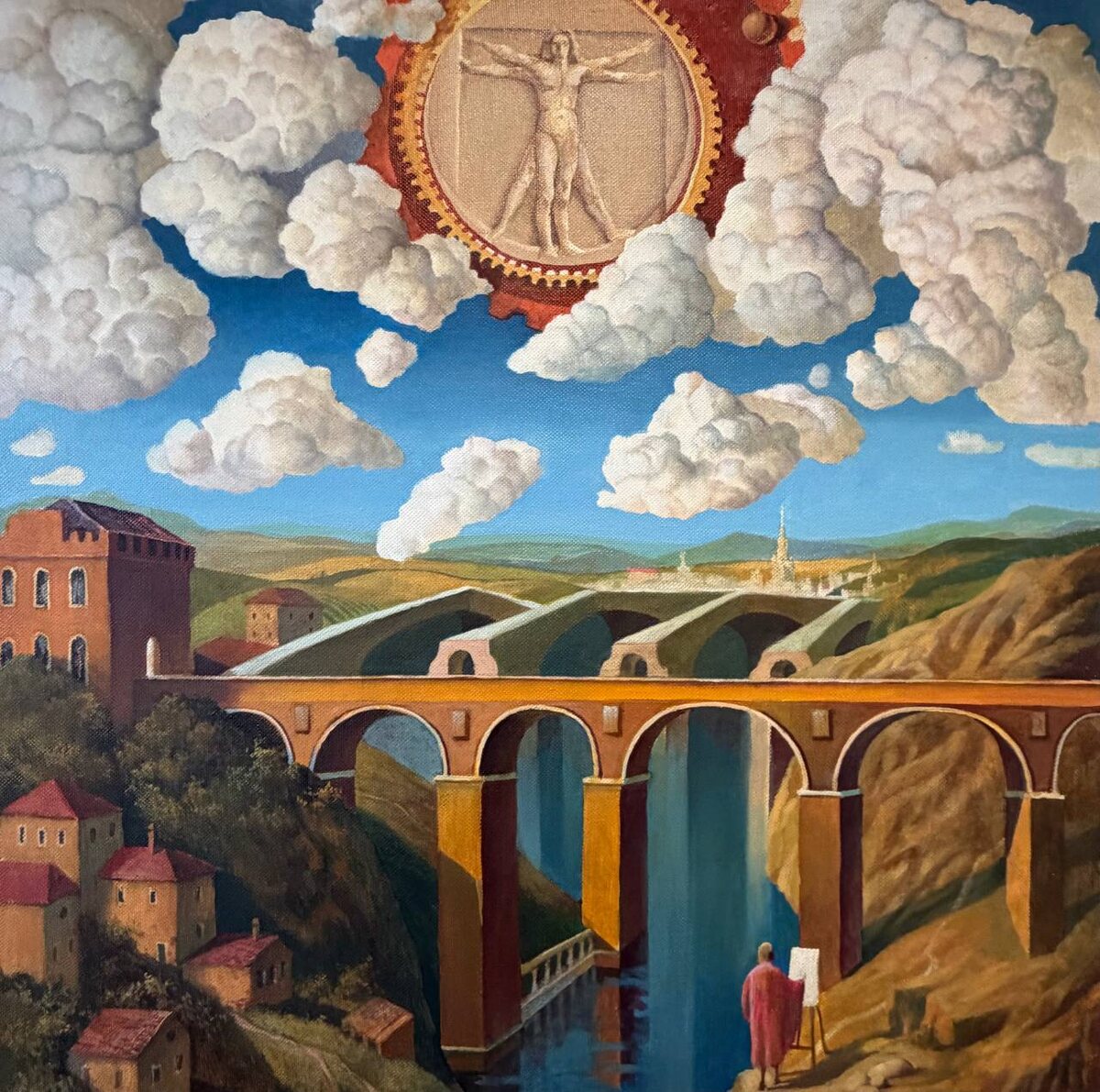 80х80 холст/масло 2025 ••• Монументальная композиция Ксении Кокориной «Акведуки времени» — размышление о бесконечности. Акведуки связывают эпохи, Флоренция возникает, как центр культурного притяжения, а фигура художника поднимает вопрос о преемственности. Витрувианский человек — символ гармонии и устройства мира здесь превращается в знак того, что творец всегда стоит перед наследием прошлого. Как у мастеров Высокого Возрождения, пространство построено рационально, но наполнено поэзией света. ••• Отдать дань почтения средневековому кватроченто, можно на выставке «Реверанс эпохе Возрождения» до 10 января 2026. ••• Москва, Ходынский бульвар 20а, с 11:00 до 21:00 ежедневно. Выставка бесплатная, работы продаются. Вся контактная информация на сайте YOLKA.art