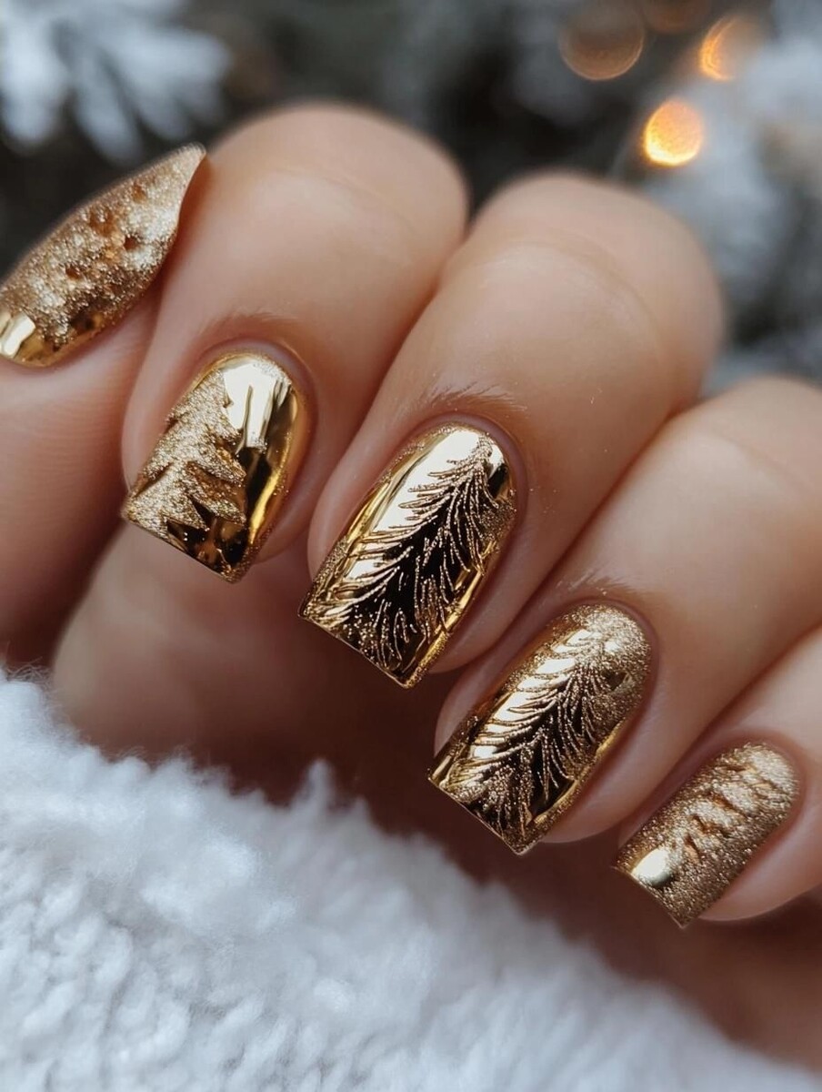 Хром – это зеркальное, металлическое покрытие ногтя, достигаемое с помощью специальной втирки (мелкоистолчёный пигмент, который втирается в липкий слой гель-лака). Металлик – менее зеркальный, но с ярким металлическим отблеском. На Новый год 2026 особенно выигрышно смотрятся серебро, платина, холодное розовое золото и стальной оттенок. Они отлично сочетаются с минималистичными платьями, костюмами, футлярами.