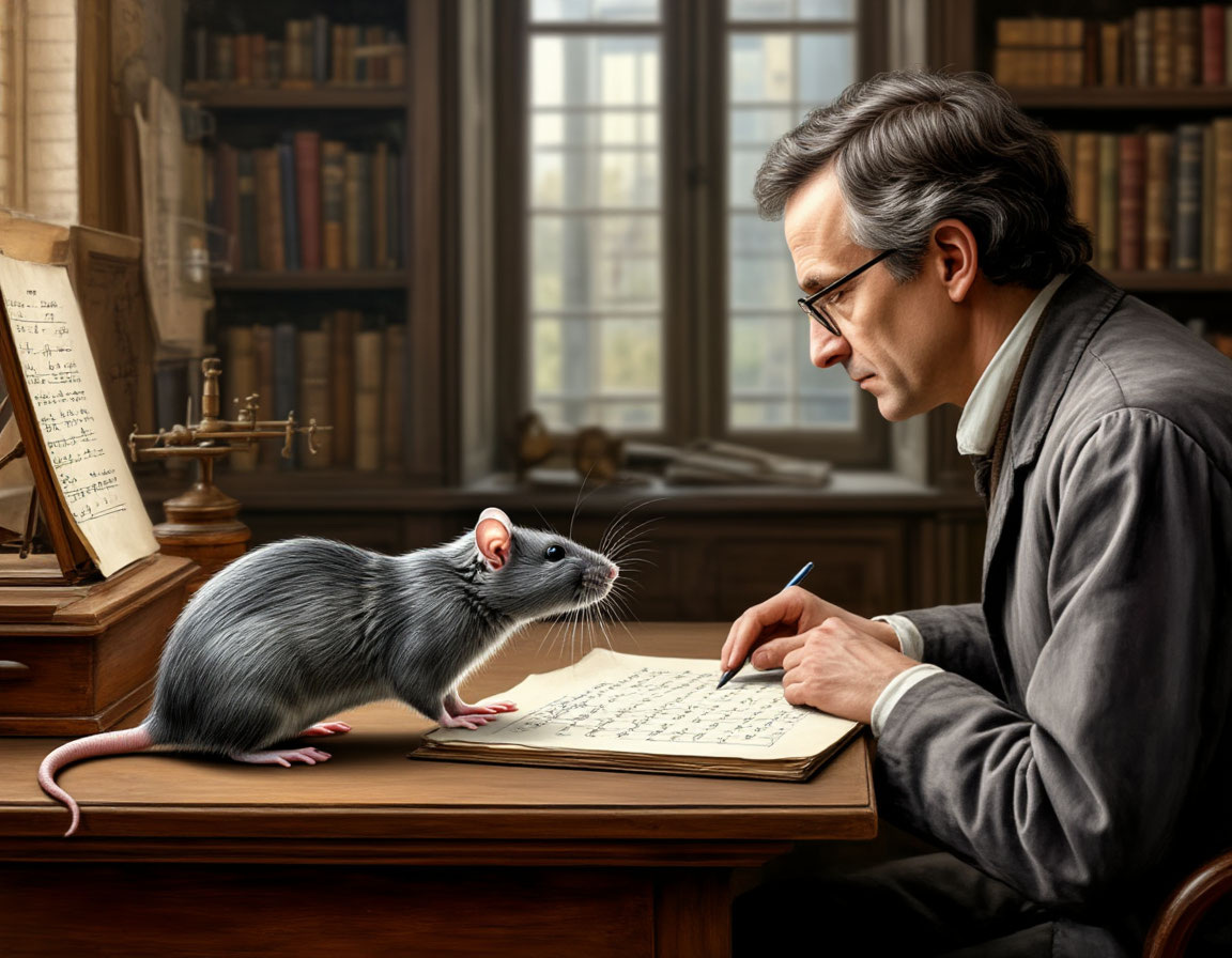 А однажды, глядя на паутину между ветвями дерева за окном, Стивен тихо сказал: — Порой мне грустно, что я лишь описываю красоту, но не создаю её. Мои формулы — лишь тени от истинного света. Рена подбежала к краю стола, где лежал круглый сыр (который Стивен оставил для неё). — Смотри, — сказала она и отгрызла от него маленький кусочек. — Теперь это уже не круг. Но твой «пи» всё ещё здесь, в оставшейся дуге. Красота не в идеальном круге, а в самой идее круга, которая живёт даже в его изъяне. Ты рассказываешь миру об этой идее. Без тебя я видела бы лишь сыр, а теперь вижу и круг, и волну, и звёздный танец. В ту ночь Стивен написал свою самую вдохновенную лекцию — о красоте математики, которая живёт повсюду: от крысиных туннелей до спиралей галактик. А Рена, слушая его за дверью, поняла, что нашла самый главный лабиринт — лабиринт человеческой мысли, и в нём не было страха, только свет познания. С тех пор математик, рассказывающий о простоте сложного, и крыса, видящая сложность в простом, стали неразлучными друзьями. Ибо они открыли для себя: чтобы понять вселенную, иногда нужно взглянуть на неё глазами Другого — даже если эти глаза маленькие, чёрные и блестящие, как две точки в бесконечном уравнении бытия.