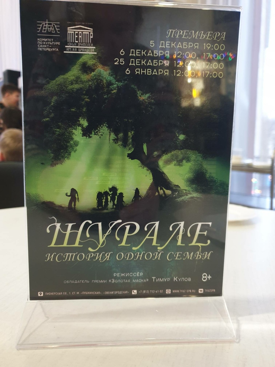 Моей дочке 14 лет, она читает Данте и сводила меня на детский утренник) Ну, честно, это моя идея пойти была на детский спектакль, а она согласилась. *** Мы на каникулах в Санкт-Петербурге. Но купить билеты в театр уже сложно - всё раскуплено. Нашли билеты в ТЮЗ, на премьерный спектакль "Шурале". ТЮЗ - нам знакомый театр. И на их новогодних представлениях мы бывали, но уже давно. Доковидных времён. Поэтому для нас вчерашний выход был немного ностальгическим) Поставили такую скульптурную композицию у театра, который отмечает в этом году своё столетие. Спектакль "Конёк-горбунок" - визитная карточка ленинградского ТЮЗа. До спектакля было новогоднее представление: замёрзшие зайчики, огнегривый конь, чью подкову стащила омолодившаяся баба Яга, и, конечно, дед Мороз со Снегурочкой, что всё разрулили и ёлочку зажгли. Шурале нам знаком. Мы были в Казани, а это один из главных местных фольклорных персонажей. Хорошо известен благодаря сказке первого татарского поэта Габдуллы Тукая. Мы эту сказку