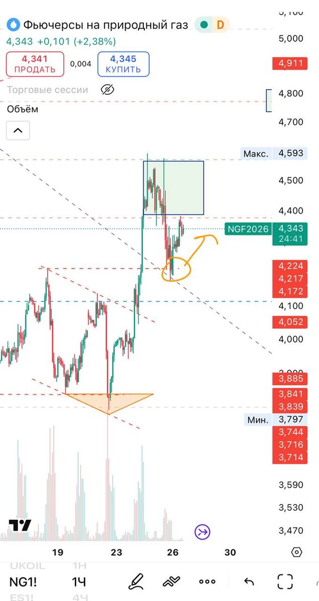 Газ отрабатывает поддержку, ожидая продолжения банкета и разрыва шортов. Полагаю, что процесс может ускориться при переходе через недельный хай