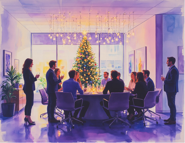 К шести вечера конференц-зал преобразился. Стол ломился от угощений, мерцала гирлянда, тихо играла джазовая версия новогодних хитов. Коллеги потихоньку собирались, уже переодетые, без пиджаков и галстуков, с оживлёнными лицами. Даже самые замкнутые программисты выглядели менее угрюмыми.