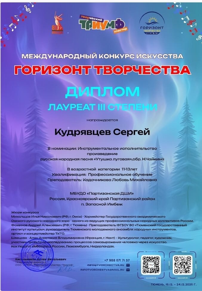 Завершился Международный конкурс талантов «Горизонт Творчества» (сезон зима 2025, г. Тюмень), в котором приняли участие талантливые исполнители из различных регионов России и Белоруссии. Учащиеся Партизанской детской школы искусств по классу баяна из поселка Запасной Имбеж представили свое мастерство на конкурсе и добились отличных результатов. В возрастной категории 11-13 лет дипломы лауреатов III степени получили Соня Гук и Сергей Кудрявцев. В старшей возрастной группе 14-16 лет Ксения Овсянникова была удостоена диплома лауреата II степени. 🌐 Сайт | 📱 Telegram | 📱 ВК | 📱 ОК | 📱 Дзен