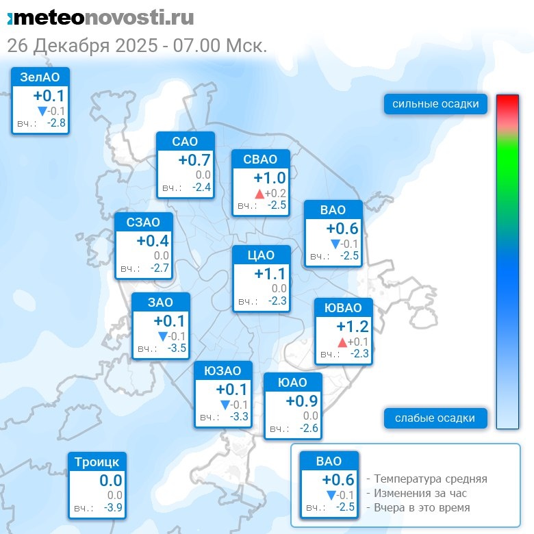 В 7:00 в Москве было от -0.4°C до +1.7°C, средняя температура +0.7°C #погода #Москва #зима #температура #26декабря #пятница