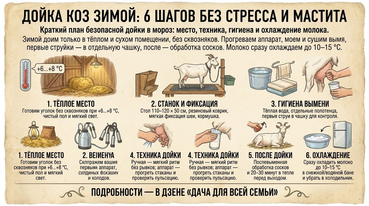 В мороз хорошая дойка — это не «героизм на ветру», а тёплое место, спокойный ритм и чистота. Тогда и коза спокойна, и молоко в порядке.