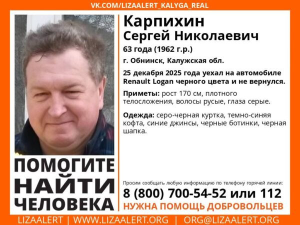 В Калужской области с 25 декабря ищут Сергея Николаевича Карпихина. Подробности сообщили в поисково-спасательном отряде «ЛизаАлерт». Мужчина 63 лет уехал из дома на чёрной иномарке Renault Logan. С того момента о его местонахождении ничего не известно. Его рост — 170 сантиметров, он плотного телосложения. У Карпихина русые волосы и серые глаза. Пропавший был одет в серо-чёрную куртку, тёмно-синюю кофту, синие джинсы, чёрные ботинки и чёрную шапку. Любую информацию о местонахождении Сергея Карпихина можно сообщить по телефону горячей линии 8-800-700-54-52 (бесплатно на территории РФ). Сергей Ус / Калуга Сегодня, ЛизаАлерт Калужской области