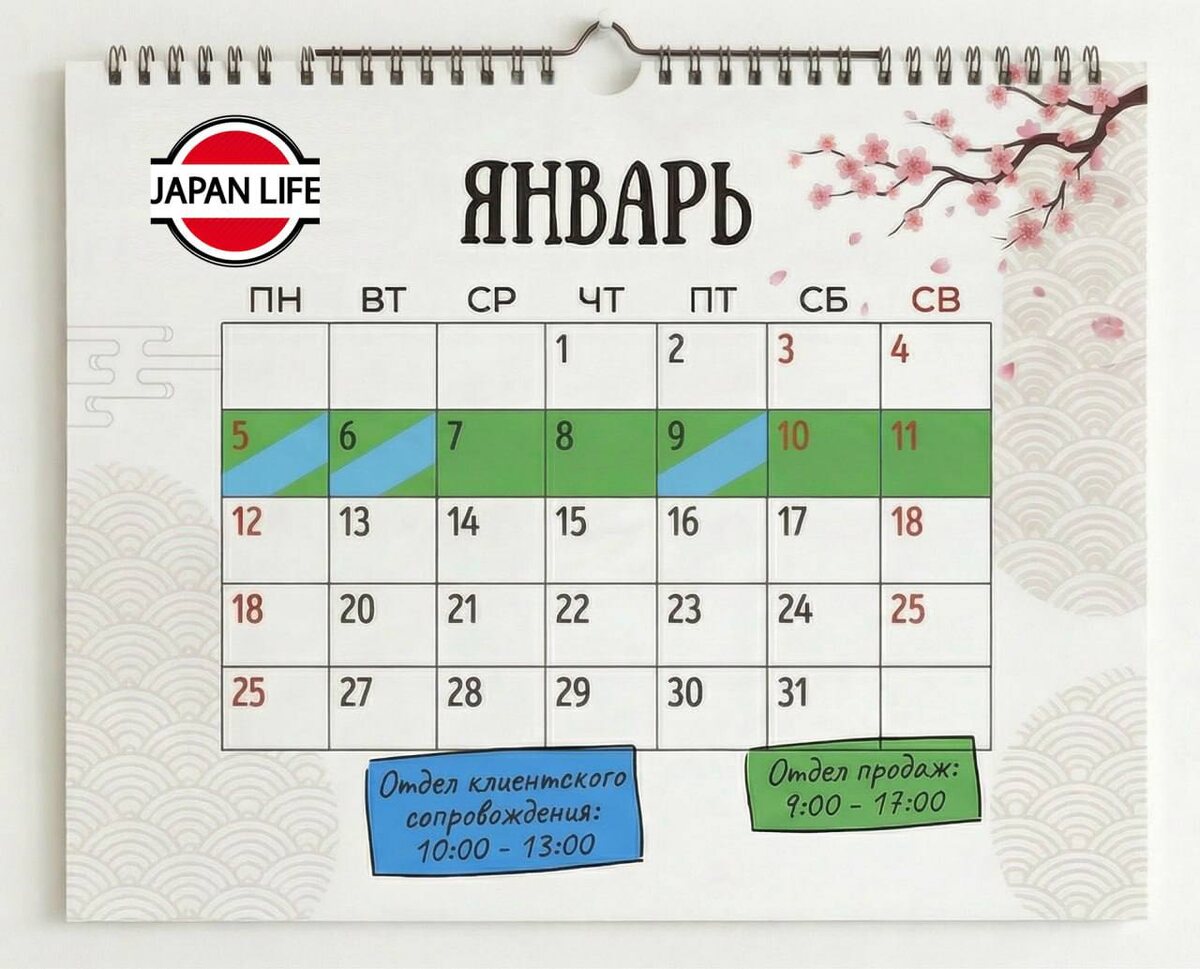 В праздничные дни Japan Life продолжает работать и остаётся на связи для консультаций и планирования покупок. Клиентский сервис: 5, 6 и 9 января — с 10:00 до 13:00 Отдел продаж: с 5 по 11 января — с 9:00 до 17:00 Наши специалисты готовы помочь вам и в праздники. С наступающим Новым годом и приятных выходных!