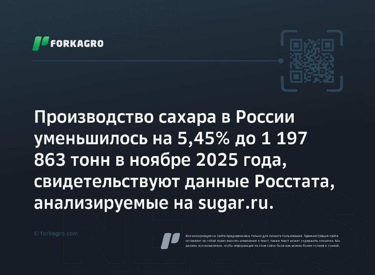 Производство сахара в России уменьшилось на 5,45% до 1 197 863 тонн в ноябре 2025 года, свидетельствуют данные Росстата, анализируемые на