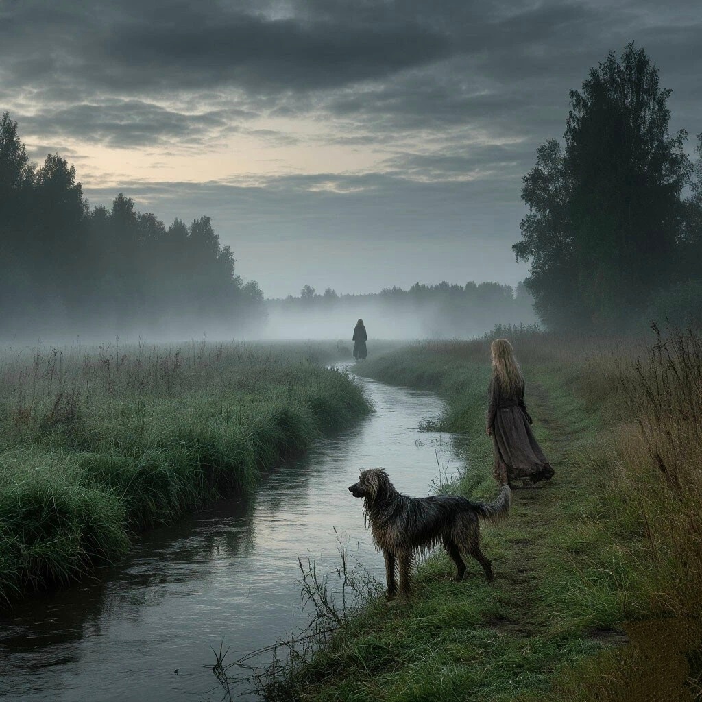 Небо стало сереть на востоке, когда пёс вывел её к реке. Туман укутывал густой пеленой луга и поросшие травой берега. И там, среди белесой дымки, Полина увидела женскую фигуру. Едва незнакомка появилась, пёс подбежал к ней, услужливо виляя хвостом.