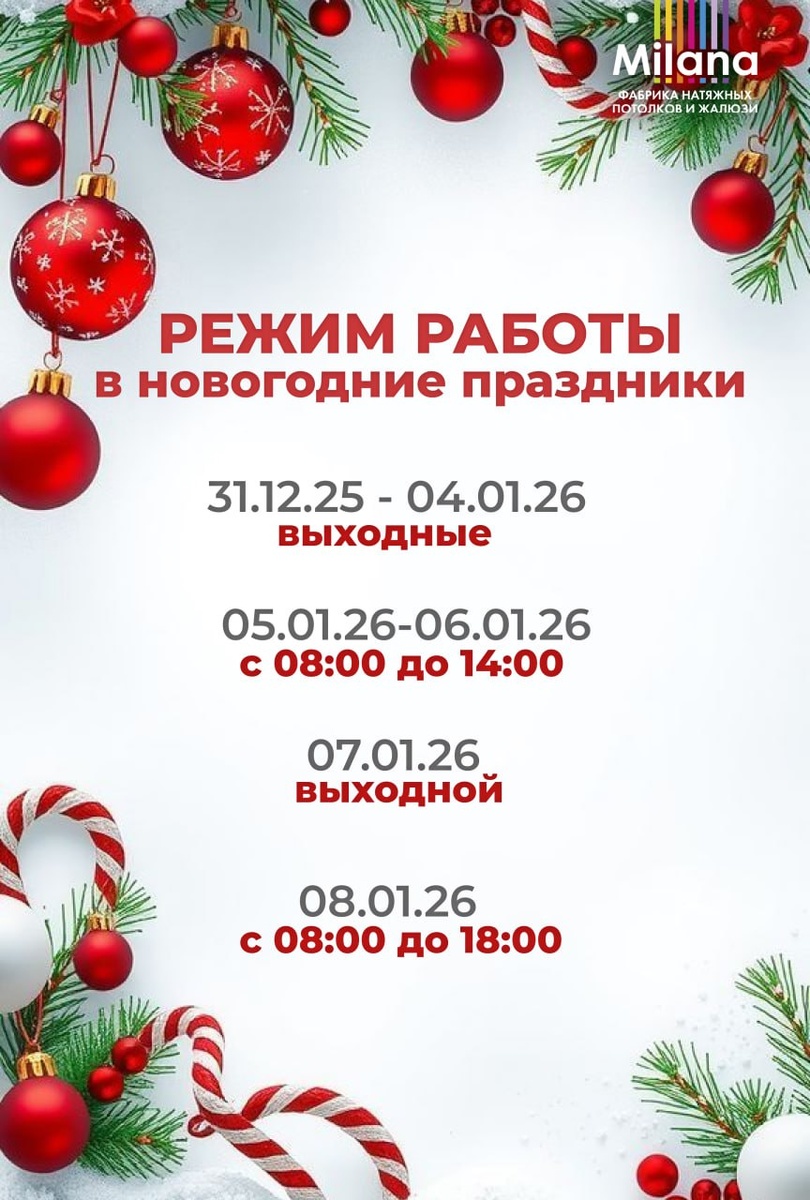 🎄 Дорогие клиенты! Сердечно поздравляем вас с наступающим Новым годом 🎉 Обратите внимание на наш график работы в праздничные дни: ➡️ 31 декабря – 4 января — выходные дни ➡️ 5 и 6 января — работаем с 8:00 до 14:00 ➡️ 7 января — выходной ➡️ с 8 января — работаем с 8:00 до 18:00 *офисы в городе Барнаул, в указанные рабочие праздничные дни, будут работать с 9:00 ежедневно (до 12 января) Пусть Новый год принесёт в ваш дом уют, красоту и комфорт 🤍 Будем рады видеть вас после праздников!