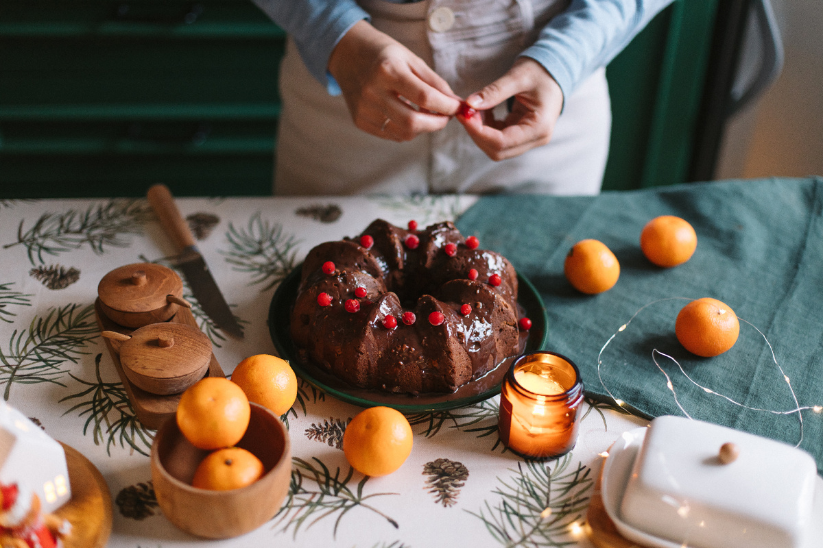 Представьте: за окном зимняя сказка, в доме запах свежей выпечки с корицей, а за столом — вся семья. Шоколадный кекс идеально дополнит эту уютную обстановку. Готовьтесь к Рождеству с нашим проверенным рецептом. Фото 1. Металлическая миска Фото 2. Венчик Фото 3. Маслёнка Фото 4. Форма для выпечки Фото 5. Деревянная миска Фото 6. Набор баночек для специй Фото 7. Кондитерская лопатка Фото 8. Кухонная кисть Яйца — 4 шт. Мука — 300 г Сливочное масло — 225 г Сахар — 150 г Какао-порошок — 50 г Ванильный сахар — 10 г Разрыхлитель — 10 г Грецкие орехи — 50 г Замороженная клюква/брусника — 50 г Корица — 1 ч. л. Для глазури: шоколад (100 г) и молоко (100 мл) Для украшения: розмарин, мандарины Приятного аппетита и счастливых праздников в кругу близких!