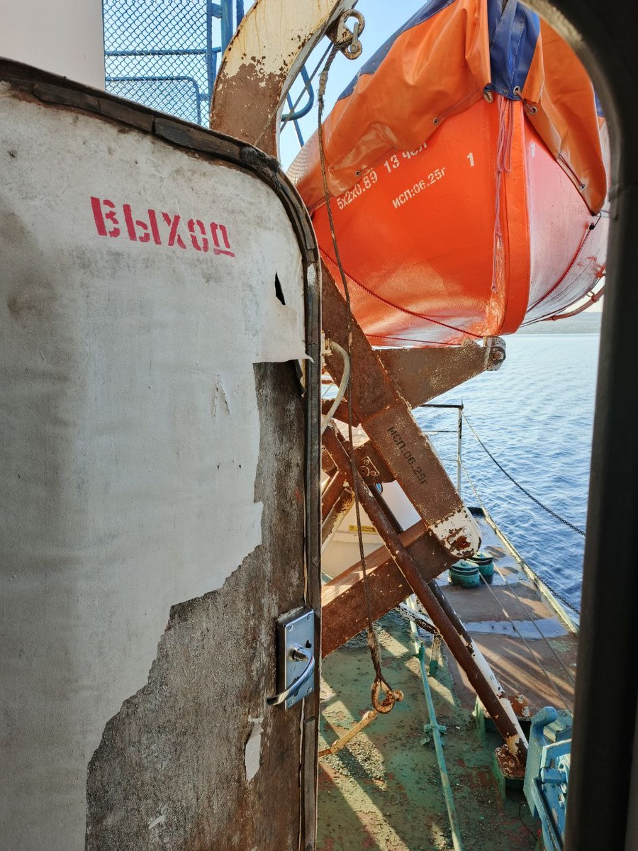Какой же всё-таки старый этот баркас 1989 года постройки 🤣 На всякий случай осматриваю спасательную шлюпку, но похоже она тоже может быть