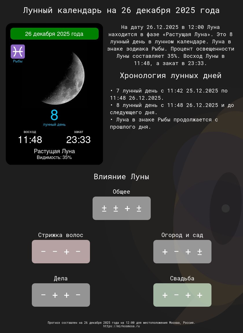 ! 🔹🌗 Лунный календарь на 26 декабря 2025 года — Что приготовила Луна? Подробнее 🔹✂️ Лунный календарь стрижек на 26 декабря 2025 года — Подходящий ли день для обновления прически? Подробнее 🔹🌱 Лунный календарь огородника и садовода на 26 декабря 2025 года — Лучшее время для ухода за растениями. Подробнее 🔹📅 Лунный календарь дел на 26 декабря 2025 года — Удачные моменты для важных задач. Подробнее 🔹💍 Лунный календарь свадеб на 26 декабря 2025 года — Подходит ли этот день для вашего торжества? Подробнее