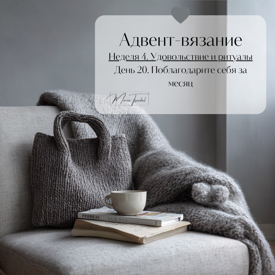 Удовольствие и ритуалы ________________________________________ День 20. Поблагодарите себя за месяц Наш Адвент подходит к концу. Завтра будем подводить итоги. А сегодня нас ждет обзор и анализ: вспомните, чему научились за месяц, какие моменты вязания радовали, что получилось особенно приятно. Можно коротко записать или мысленно перечислить свои достижения. Это помогает ценить себя и процесс, осознать результаты и почувствовать удовлетворение. Даже маленькая победа достойна внимания. За что вы хвалите себя сегодня? * Весь декабрь по будням в 8:00 у нас выходят задания для вдохновения и уюта. Участвуйте в нашем маленьком челлендже. Присоединяйтесь в любой момент. Вся программа Адвента здесь: https://dzen.ru/media/feelknit/privet-dorogie-692d209978188f2a4af3e736