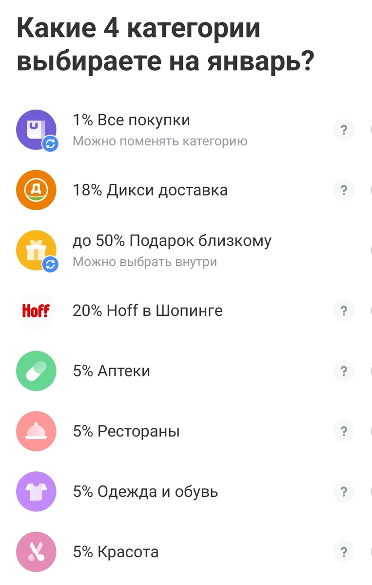 Т-банк предложил следующие категории. Они сейчас экспериментируют и в январе есть категория "подарок близкому", где можно выбрать из 3 категорий одну: подписка про, премиум и кэшбэк. Банк предлагает подарить одну категорию на выбор и вернуть часть денег кэшбэком.
