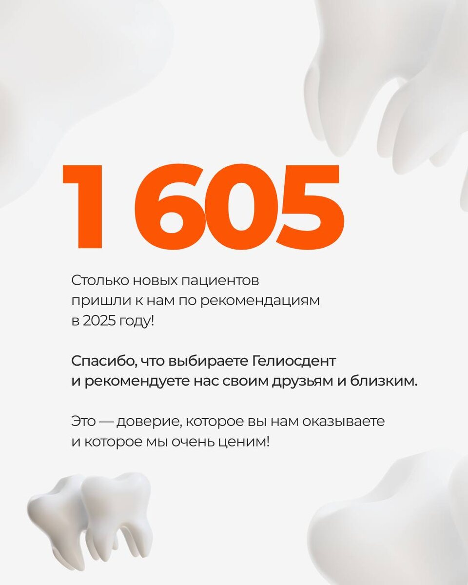 🤍 Для нас это не просто цифра. Это доверие, которое вы оказываете клинике Гелиосдент, и лучшая оценка нашей работы. Спасибо, что выбираете нас и рекомендуете своим близким — мы это ценим. Напоминаем: если вы рассказываете о нас друзьям или родным, мы с радостью начисляем вам 2 000 бонусных баллов за рекомендацию. Бонусы можно использовать на стоматологические услуги в нашей клинике. Подключайтесь к нашему Telegram-помощнику, чтобы: — быстро записываться на приём — получать полезные напоминания и советы — быть в курсе новостей клиники — и получить приветственные бонусы 🎁