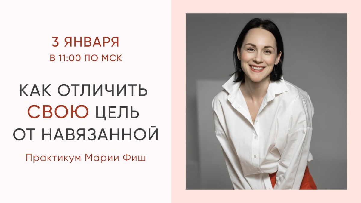 Как понять, цель действительно ваша, или ее навязывают вам родители, общество, муж или работодатель? На практикуме «Как отличить свою цель от навязанной» психолог Мария Фиш поможет разобраться в этом непростом вопросе. На практикуме вы узнаете: Этот практикум для вас: Практикум пройдет 3 января в 11:00 по мск в формате Zoom конференции (всем, кто регистрировался на вебинар, ссылка уже пришла по почте) Длительность – 1 час. Как будет проходить практикум: сначала Мария расскажет о навязанных целях, и как их отличить от своих настоящих. А затем, вы сможете задать ей вопросы. Заранее подготовьте ручку и бумагу. Мария даст интересные письменные практики. Практикум начнется в 11:00 по мск и пройдет в формате Zoom конференции для тех, кто готов принять участие с камерой микрофоном, и вебинара на платформе Бизон для тех, кто хочет быть просто зрителем и задавать вопросы психологу в чате. Участвовать с камерой и микрофоном: https://us02web.zoom.us/j/82531525428?pwd=LZ82mcu2EX8mF9BB0NjWi2IyPJd