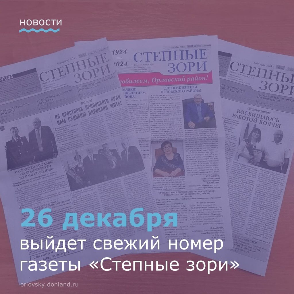 В свежем номере районной газеты «Степные зори» от 26 декабря читайте: – Подводим итоги, планируем будущее: традиционное предновогоднее интервью с главой Орловского района Юрием Харенко. – Заповеднику «Ростовский» – 30 лет! – Турнир «Заповедные острова». – Строя заповедник с нуля: как начинался «Ростовский»: по материалам профессора В.А. Миноранского. – 27 декабря – День спасателя: Награды за самоотверженность. – АО «Корммаш»: Выставка «ЮгАгро-2025»: успешное участие добавило уверенности. – Отдыхаем вместе в Новогодние и Рождественские дни. – Вокальный конкурс: «Две звезды» зажгли новые таланты. – Молодёжь: Быть первыми – это по-нашему! – Александр Ищенко подвёл итоги законодательной работы за 2025 год. – СВОих не бросаем: От первоклассников до выпускников – Орловская школа 2 собирает гуманитарную помощь. – Спорт: Проявили характер и волю бойцы спортклуба «Ермак». – Об ограничении на использование, а также на реализацию пиротехнических изделий на территории Ростовской области. Также в н