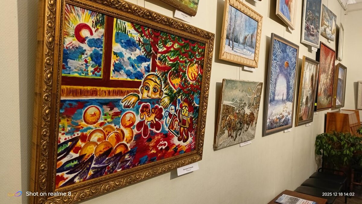 , которая будет проходить до 17 января. В день развески в экспозиции представлено 56 работ 33-х авторов. Имена многих художников хорошо знакомы посетителям галереи, почитателям их творчества: Владимир Гуторкин, Екатерина Штуц, Игорь Максютин, Дмитрий Лёвин, Александр Горшков, Андрей Шмельков, Геннадий Кислицын, Илья Кошкин, Игорь Гугель, Евгения Яговкина, Владимир Пименов, Игорь Козлов, Сергей Лучко, Юлия Молчанова, Ольга Удянская, Юрий Сизов, Людмила Фролова, Ольга Клеруа, Тамара Харченко, Михаил Григорьев, Маргарита Курбанова, Анна Ларина, Елена Григорьева. Среди новых имён - Наталья Арустамова, художник-преподаватель ДШИ «Фламинго» из г. Белозёрского, представившая красивые графические работы в смешанной технике, и Марина Арабаджи, автор романтических живописных работ. В витринах представлены новогодние сувенирные изделия известных производителей: сказочные игрушки питерской мастерской «На Ланской», пермская мини-скульптура из селенита, стеклянная игрушка из Гусь Хрустального и