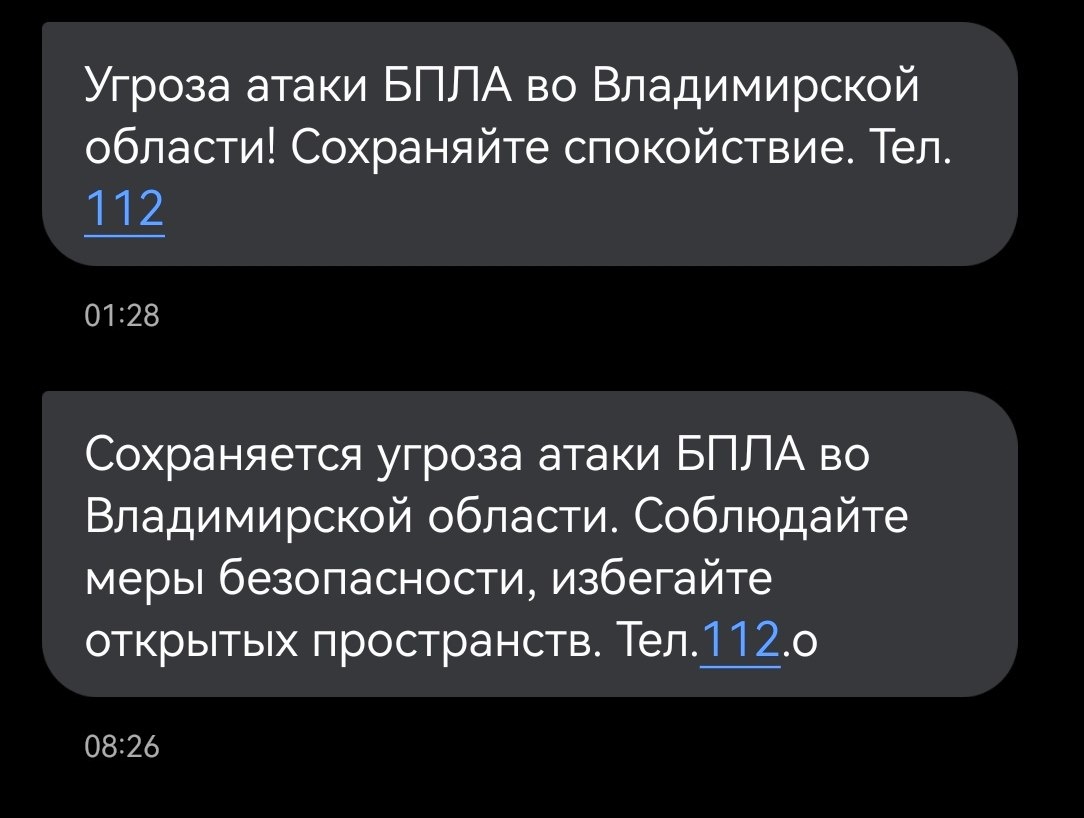 «Угроза атаки БПЛА во Владимирской области! Сохраняйте спокойствие». Такие тревожные СМС-сообщения в последние месяцы владимирцы получают от РСЧС почти каждый день. Как рассказали в правительстве региона, по данным на 17 декабря, за этот год угроза атаки беспилотниками объявлялась более 60 раз. С тех пор владимирцы получали оповещения о возможной беспилотной атаки еще неоднократно, так что их количество уже приблизилось к 70. Как действовать, когда сообщения об угрозе атаки и ее отмене приходят, и зачем указан номер службы спасения – знают далеко не все. На запрос «Чеснока» вице-губернатор Эдуард Селезнев объяснил, что СМС-рассылка от РСЧС «является наиболее оперативным способом оповещения об угрозе атаки БПЛА». В Белом доме пояснили, что предупреждения приходят не просто так. Ожидается, что владимирцы будут действовать, как предписывает памятка, но практически никто указания не соблюдает. Подписаться | Предложить новость