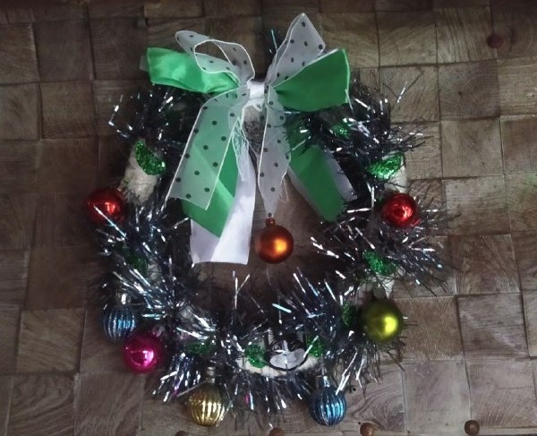 Скоро Рождество – любимый и долгожданный праздник нашей семьей. Мы так не встречаем Новый год, как Рождество. Новый год взрослые дети отмечают со своими семьями, а вот на рождественские каникулы всегда собираемся у нас в отчем доме. Четыре поколения вместе – это так прекрасно! Это стало доброй традицией нашей семьи. И к этому замечательному празднику я решила смастерить рождественский венок. Техника очень простая: круг из картона, а дальше – как подскажет вам фантазия. Если есть живые ветви ели или сосны, то венок получится еще лучше. Но елка у нас искусственная, в нашей местности с елками напряжёнка, поэтому мастерим из мишуры и елочных игрушек. Вот такой бант от дочкиного платья тоже нам пригодится. Когда-то он украшал и нашу пасхальную корзину, но в этом году мы будем делать новые украшения. Но это я забегаю вперед, а пока – Рождество и рождественский венок. А в вашей семье есть традиции, связанные с Рождеством?