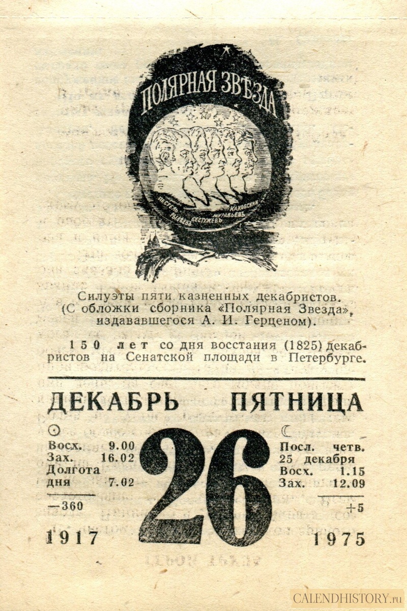 26 декабря 1975-го года — Календарь для женщин ПОЛЯРНАЯ ЗВЕЗДА КАХОВСКИЙ, БЕСТУЖЕВЬ, МУРАВЬЕВЬ, ПЕСТЕЛЬ, РЫЛЬЕВЬ Силуэты пяти, казненных декабристов. (С обложки сборника «Полярная Звезда», издававшегося А. И. Герценом). 150 лет со дня восстания (1825) декабристов на Сенатской площади в Петербурге. Больше старых советских отрывных календарей смотрите у нас на сайте - calendhistory.ru https://calendhistory.ru/26-dekabrja-1975-go-goda-kalendar-dlja-zhenshhin/