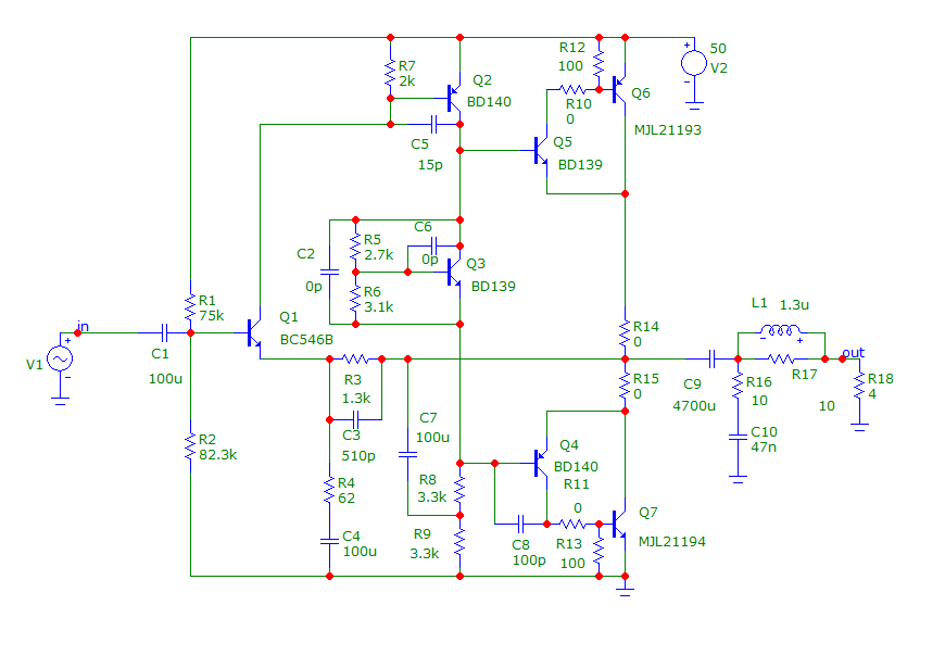 Схема из сайта https://vpayaem.ru/amp65.html Выше представлена схема модели. На конденсаторы С2, С6, резисторы R10, R11 - с номиналом 0 не обращайте внимания. Могут понадобиться при настройке. R14, R15 , которые ставят для стабилизации теплового режима, сильно увеличивают коэффициент гармоник. Поэтому тоже не нужны. Отсутствие этих резисторов накладывает ограничение на напряжение питания - для обеспечения надежности оно должно быть не выше, указанного на схеме. Так же неплохо позаботиться о хорошем охлаждении выходных транзисторов - их желательно установить на отдельный радиатор без изолирующих прокладок. Коллекторы соединены вместе - это позволяет 2 выходных транзистора установить на одном радиаторе.