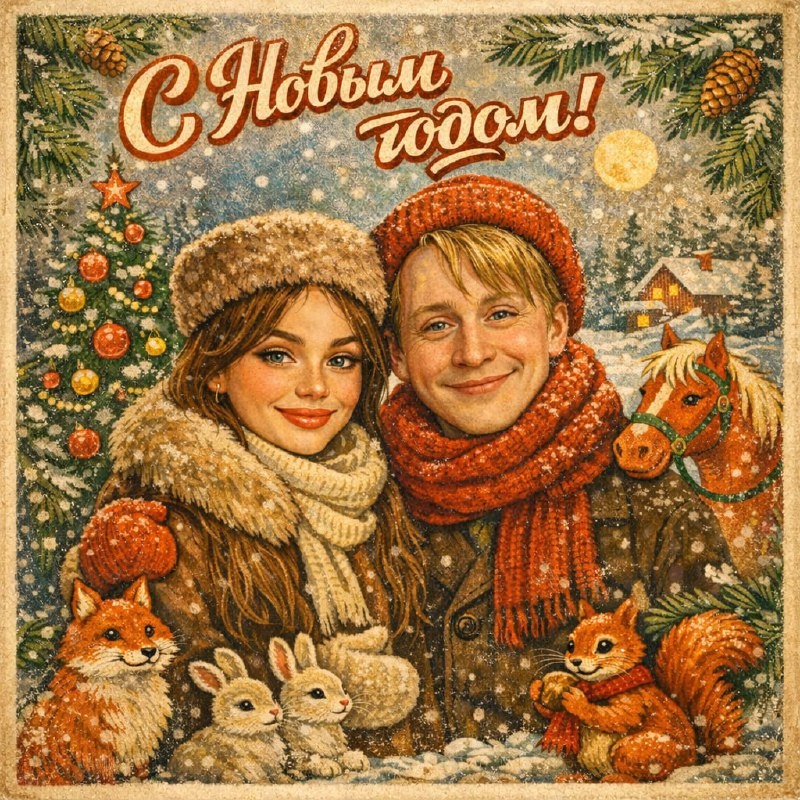 Ловите промпты для создания новогодних открыток в стиле 50-70х с собой в главной роли. Достаточно скинуть чат-боту свое фото и добавить один из промптов. 🟡Открытка с котиками: Праздничная иллюстрация в стиле старых советских открыток середины XX века, выполненная гуашью. Композиция: женщина в меховой шапке держит (кота), рядом мужчина в зимнем пальто с (котом). Критически важно: лица персонажей и животных точно воспроизводят черты, пропорции и выражения с приложенных фотографий, адаптированные под живописный стиль. Окружение: заснеженный городской пейзаж, украшенные ёлки, крупные снежинки. Колористика винтажная – приглушённая палитра с голубовато-белыми и тёплыми красно-коричневыми акцентами, эффект выцветшей полиграфии. Текстура бумаги шероховатая... #AI #aiбезграниц #машинноеобучение