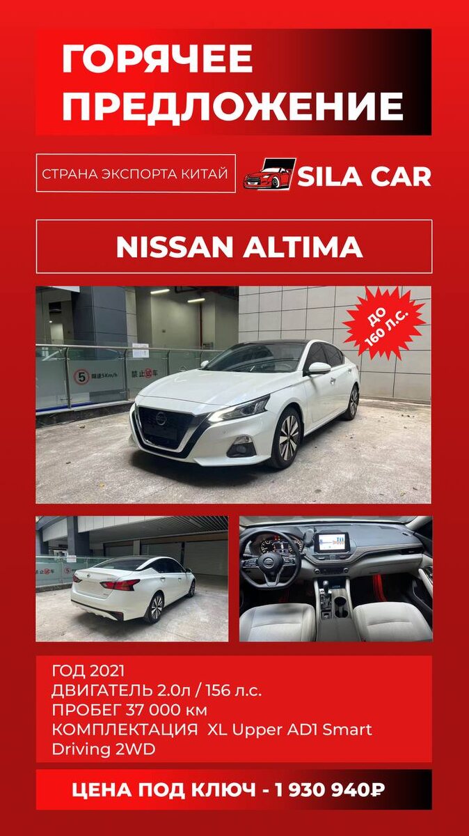 🔥 Автомобиль в наличии в Китае! 🚘 NISSAN ALTIMA 📍Год: 2021 📍Двигатель: 2.0л / 156 л.с. 📍Пробег: 37.000 км 📍Комплектация: XL Upper AD1 Smart Driving 2WD ❤️🔥 ЦЕНА ПОД КЛЮЧ: 1.930.940₽ 📍Для консультации и брони автомобиля пишите менеджеру Дмитрию 📱+7(908)979-36-92 📱 @SilaCarDm Для расчета стоимости авто жмите сюда и пишите нашим менеджерам💪 Или звоните: 88007002375 А для тех, кого интересует автокредит: +79147036533 Самостоятельный расчет на нашем сайте: silacar.ru СИЛА КАР – СИЛА В ПРАВДЕ💪