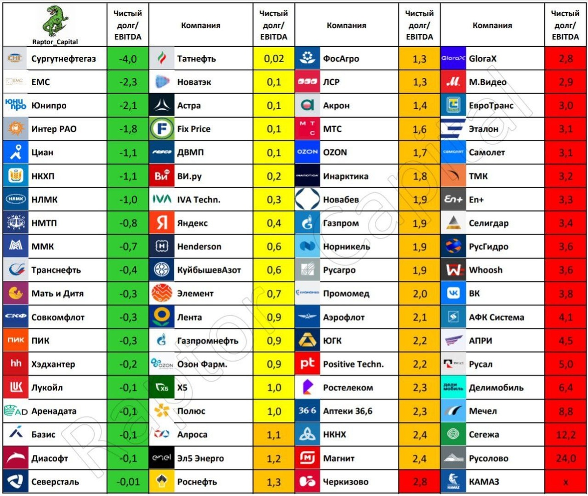 🟡 Жёлтым цветом отметил компании с умеренной долговой нагрузкой. У этих компаний чистый долг меньше, чем годовая EBITDA, поэтому в большинстве случаев у таких компаний нет проблем с обслуживанием долга.