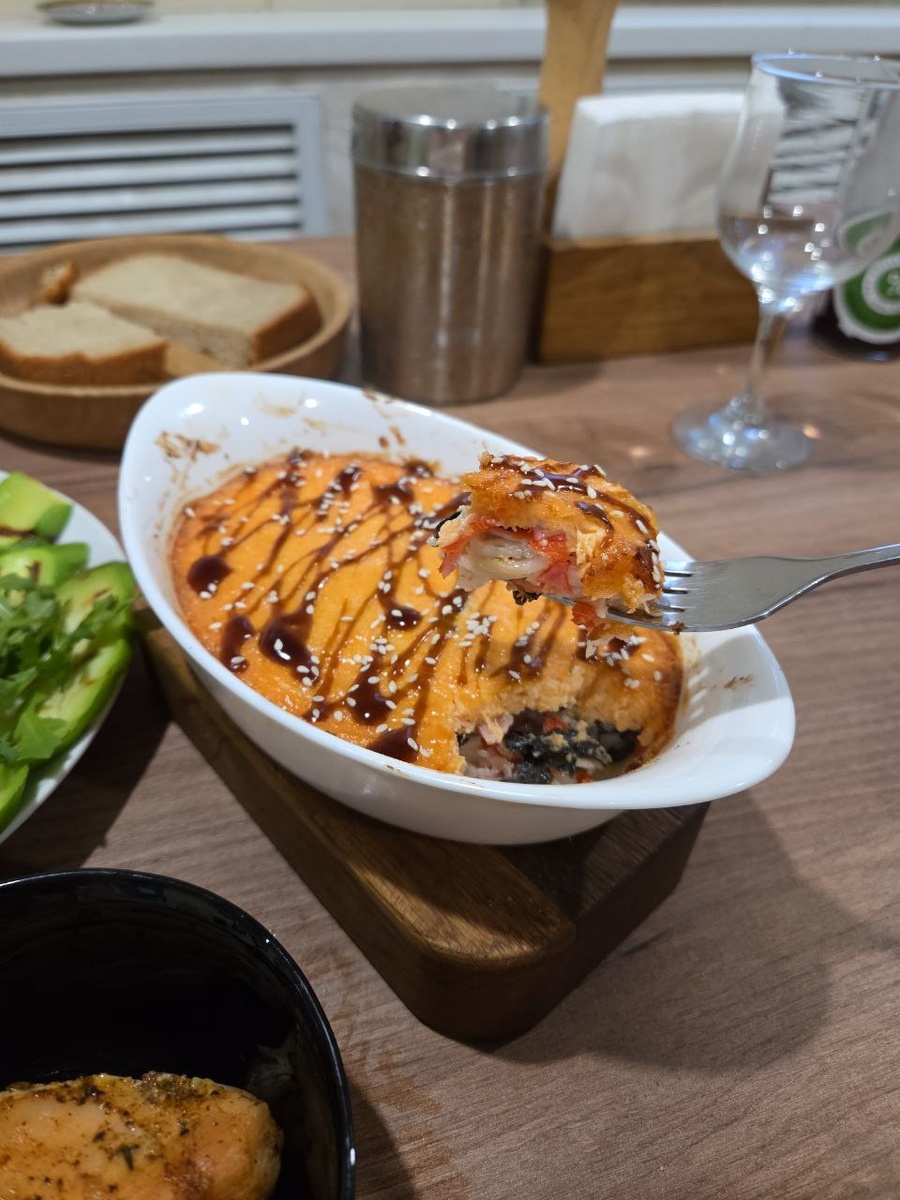 Тестила моднуюзакуску-ленивые роллы. Что сказать, я была в восторге, роллы я люблю, но рис не ем. Без риса очень вкусно. Для семьи можно запечь в тарталетках. Или накрутить роллы и запечь. Ну и под настроение чизкейк сникерс на белом шоколаде.
