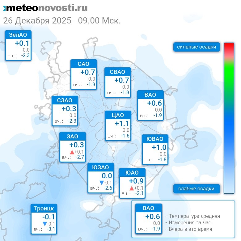 В 9:00 в Москве было от -0.5°C до +1.4°C, средняя температура +0.6°C #погода #Москва #зима #температура #26декабря #пятница