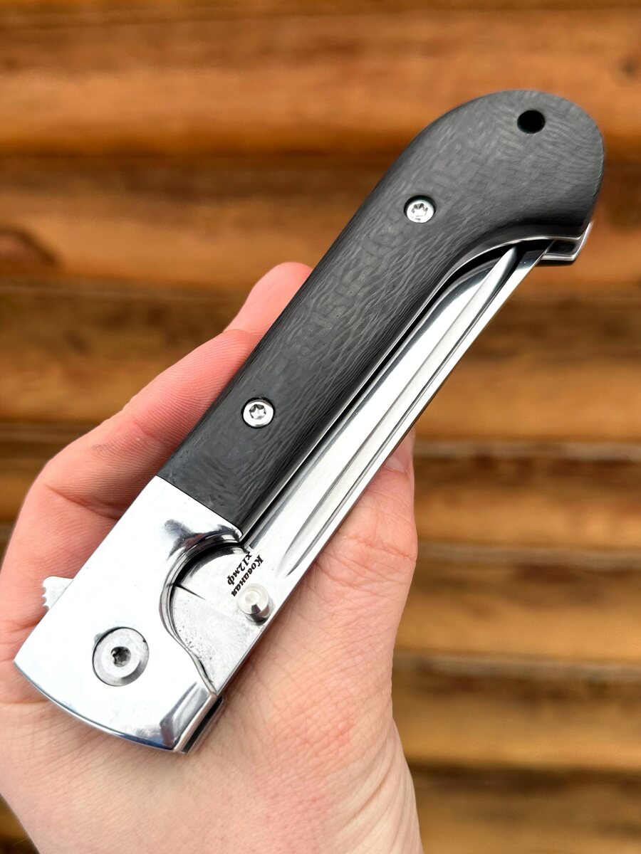 ! 🔹 Классический клинок: широкий, с фрезерованным долом и спусками от обуха — оптимален для работы на природе и дома 🔹 Сталь Х12МФ (62 HRC, зональная термообработка) — держит остроту даже при активном использовании 🔹 Плавный ход благодаря керамическим подшипникам 🔹 Надёжный LINER lock — защита от случайного складывания 🔹 Элегантные накладки из карбон и нержавеющие плашки 🔹 В комплекте — кожаные ножны ручной работы 💰 Цена: 18 000₽ 🔥 Со скидкой: 15.800₽ 📲 Для заказа — пишите @Nazarklinokbot или WhatsApp/Viber: +7 910 134-38-31 #Пчак #СкладнойНож #РучнаяРабота #КузницаНазарова #Охота #Туризм #ПодарокНастоящемуМужчине
