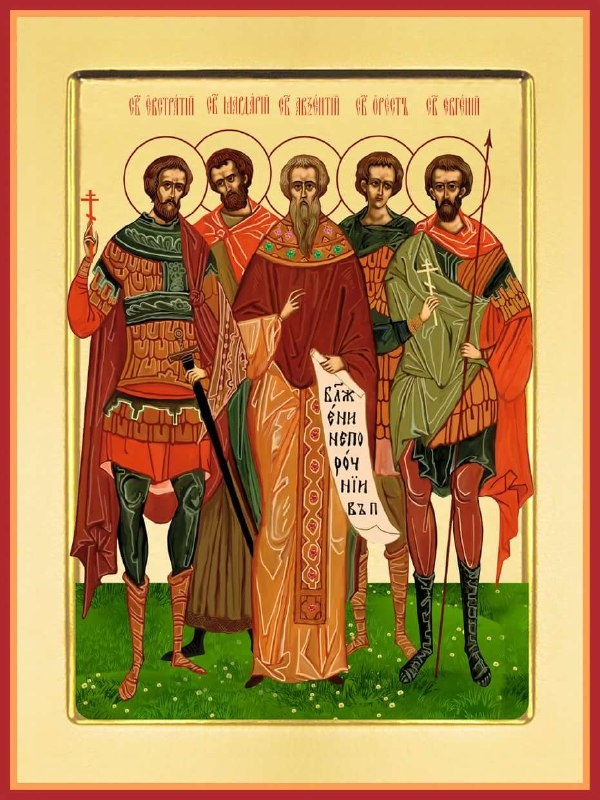 Святые мученики Евстратий, Авксентий, Евгений, Мардарий и Орест пострадали за Христа при императоре Диоклитиане (284–305) в Севастии, в Армении. В числе первых христиан, принявших тогда мучения, был пресвитер Аравийской церкви мученик Авксентий, заключенный в темницу. Видя непоколебимость христиан, градоправитель Саталиона, благородный военачальник святой Евстратий, бывший тайным христианином, решился на открытое исповедание веры, за что был подвергнут пыткам: его избивали, надевали на ноги железные сапоги, жгли огнем. После этих жестоких мучений его сожгли, а мученика Авксентия обезглавили. Увидев их мученическую смерть, святой Мардарий, который был из простого народа, также исповедал свою веру и был повешен вниз головой. Перед кончиной он произнес молитву: «Владыко Господи Боже, Отче Вседержителю...», которая читается в конце 3-го часа и на полунощнице. Мученику Евгению вырвали язык, отрубили руки и ноги и отсекли голову мечом. Молодой воин святой Орест исповедал себя христианином и