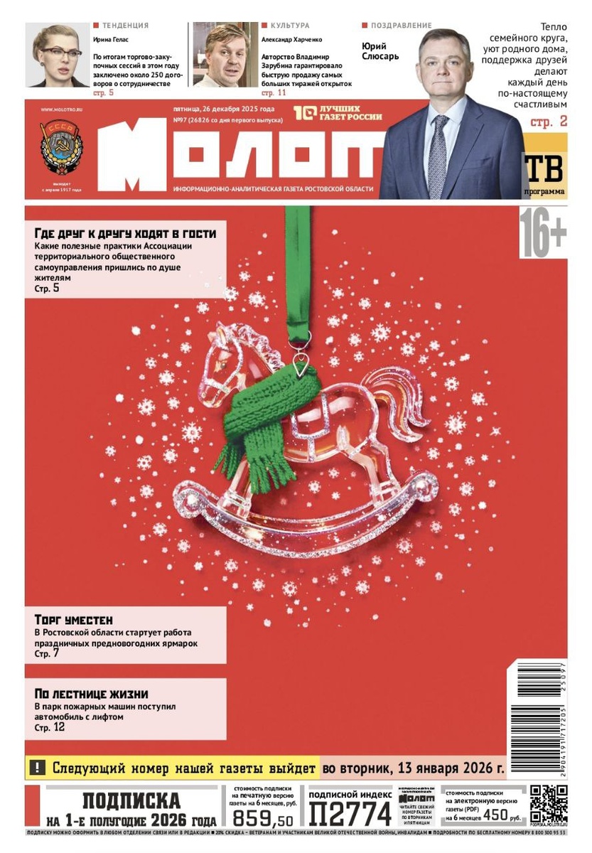 » 📌Где друг к другу ходят в гости В Ростовской области по поручению губернатора Юрия Слюсаря создана Ассоциация территориального общественного самоуправления. Какие полезные практики пришлись по душе жителям, выяснила Ирина Варламова. 📌Торг уместен В донском регионе заработали предновогодние ярмарки. По каким адресам можно выгодно купить продукты к праздничному столу, читайте в «Молоте». 📌По лестнице жизни В парк пожарных машин поступил автомобиль с лифтом. Он установлен на автоматической лестнице, по которой можно подняться до 15-го этажа — на высоту 52 м. Оборудованная лифтом конструкция удобна в эксплуатации и позволяет эффективно проводить эвакуацию людей из высотных домов. ❗️Также в номере: анонс «Новогодних ёлок» и других культурных событий в городах и районах области от Виктории Головко, новости спорта, кроссворд и телепрограмма. ☕Читайте «😜олот», у нас надежные источники! Оформляйте подписку на «Молот» во всех отделениях Почты России и на сайте Don24.ru. 😜 Подпишись