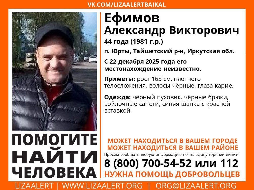 ! Пропал #Ефимов Александр Викторович, 44 года, п. #Юрты, #Тайшетский р-н, Иркутская обл. С 22 декабря 2025 года его местонахождение неизвестно. Если вы обладаете данными о местонахождении этого человека, просьба звонить на горячую линию отряда 8-800-700-54-52 или 112. Всего один ваш репост — и, возможно, именно вы поможете кому-то вернуться домой!