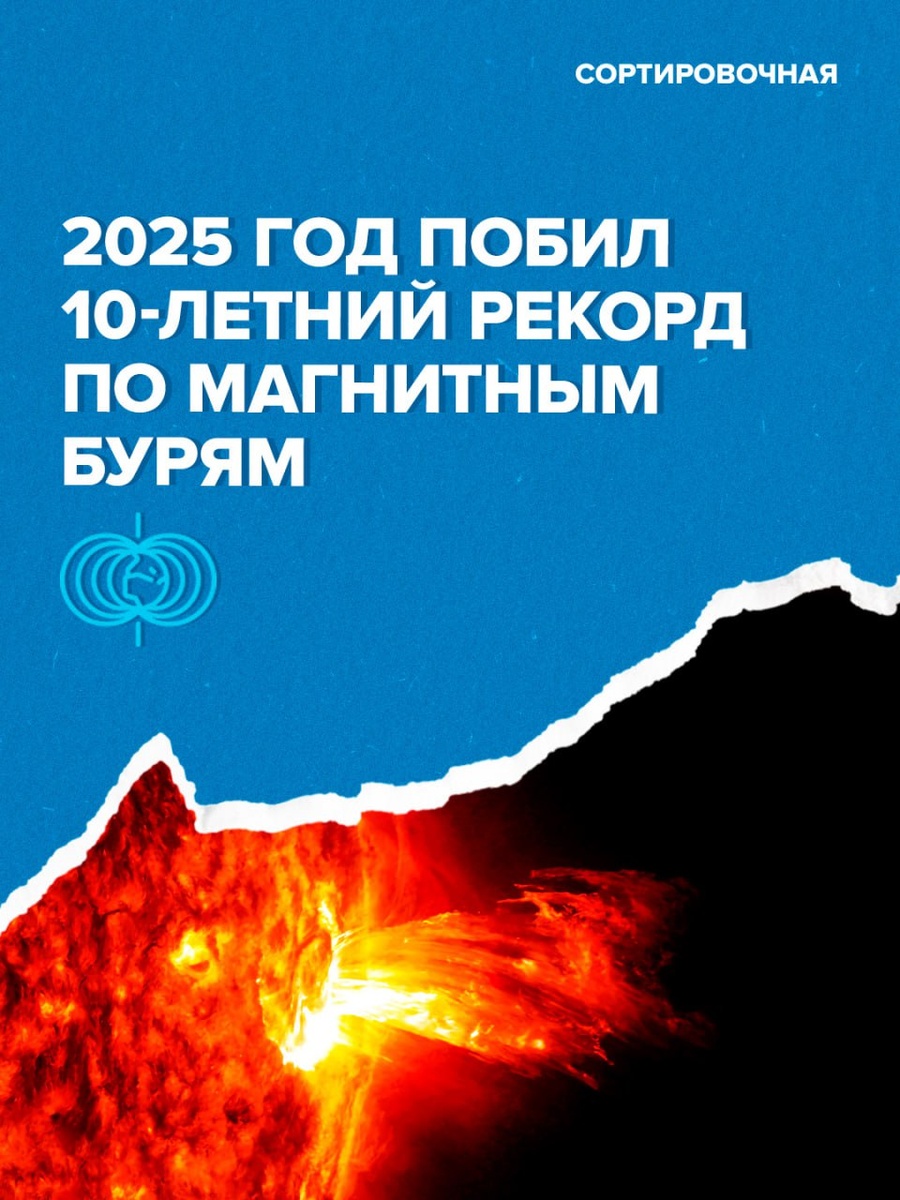 : *️⃣ 69 дней с геомагнитными возмущениями; *️⃣ 164 дня с повышенной геомагнитной активностью, на 75% больше, чем в прошлом году. Число дней с магнитными бурями связано с аномально большим количеством корональных дыр на Солнце. Период повышенной солнечной активности, вероятно, продлится и в первые месяцы 2026 года. Метеозависимые, держитесь! 🤍 Подписаться на Сортировочную👍