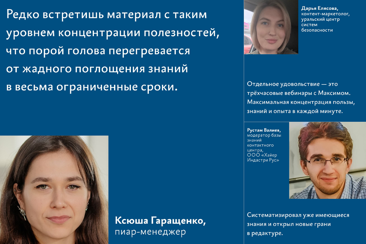 На странице обновлённого и дополненного курса Максима Ильяхова «Информационный стиль и редактура текста» опубликовано три новых отзыва. Ближайший курс пройдёт в дистанционном формате 31 января — 27 февраля. После 1 января повышение стоимости — успейте сэкономить 30%. Курс посвящён сильному тексту: лаконичному, информативному и ясному. Участники учатся отбирать информацию, структурировать предложения, выбрасывать ненужные слова и добиваться ясности; повышать доверие читателя и продавать товар. Ксюша Гаращенко, пиар‑менеджер: «Пока лучший курс в онлайне, который я проходила. Казалось бы, обучение для редакторов, но здесь рассказывают и про смыслы, и про приёмы продавать с помощью контента, и про визуалку — всё это пиарщику тоже нужно в работе. Особенно мне были полезны разборы домашки на звонках, взгляд на старые‑добрые пресс‑релизы по‑новому». Дарья Елясова, контент‑маркетолог, уральский центр систем безопасности: «Информация полезная, хорошо структурированная, узнала много нового, хот