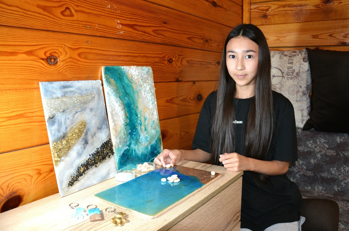 Застывшие миры Фарзаны Семиклассница Фарзана Калимуллина из села Хусаиново открыла мир эпоксидной смолы два года назад. В интернете она увидела видео, где создавали море в миниатюре. Её вдохновила сама природа, а именно - магия воды и камня. Сначала Фарзана просто смотрела и восхищалась работами мастеров, но потом решила попробовать сама. Заказала свой первый стартовый набор для творчества. Первым толчком стало желание создать собственный «кусочек моря», который будет напоминать о лете. Девочка изготовила уже более восьми полноформатных картин и бесчисленное количество небольших миниатюр, которые стали украшением интерьера родного дома. А из остатков смолы Фарзана решила сделать брелоки. «Я изготовила их очень много, - делится школьница. - Это простые геометрические фигуры с сухоцветами внутри и брелоки в виде моря, мишек и многое другое. Это моё малое творчество, идеальное для оттачивания техники и использования остатков смолы. Обучение проходила самостоятельно. Методом проб и ошибок: