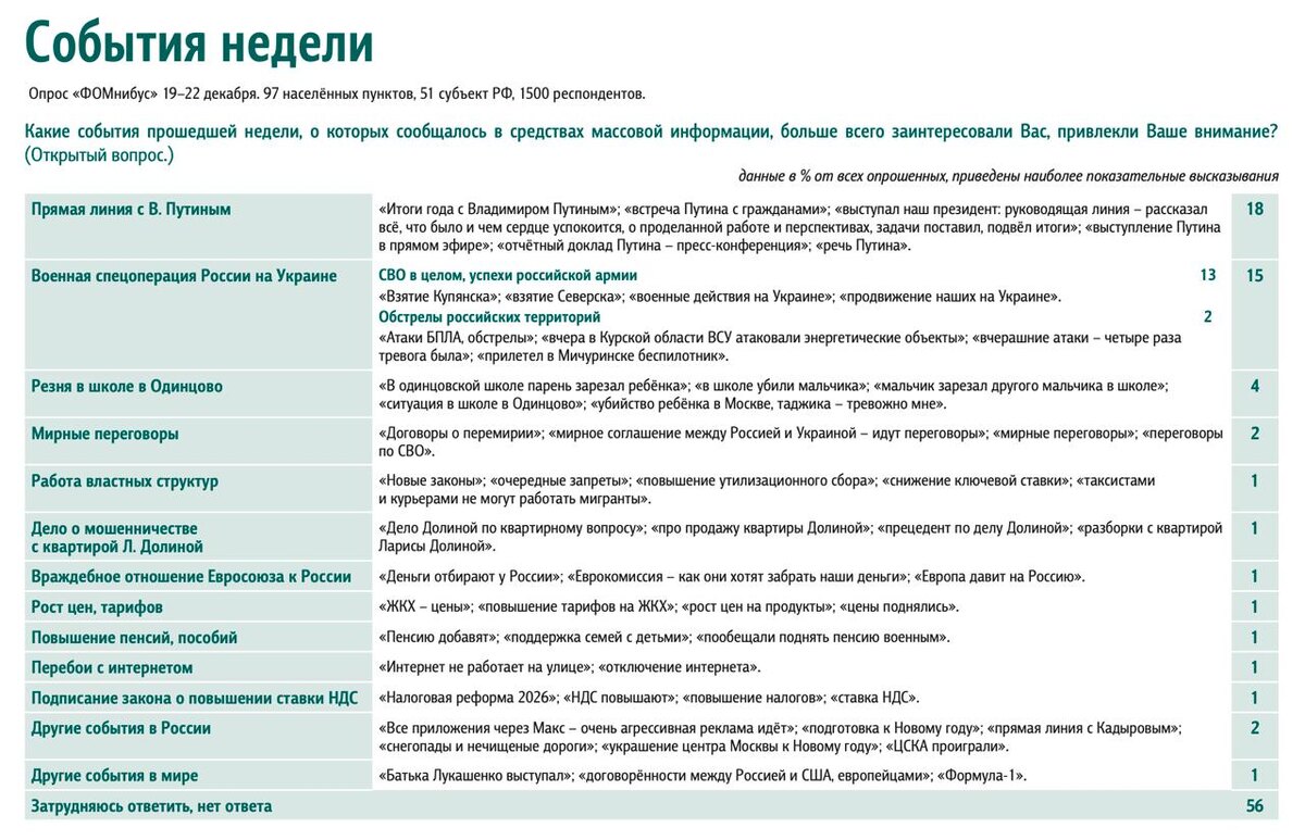 Поле мнений. Выпуск 51 События недели и настроение окружающих Результаты еженедельного опроса 19 – 22 декабря 2025 года. Полный выпуск: fom.ru #доминанты #ФОМнибус 📱 Фонд Общественное Мнение