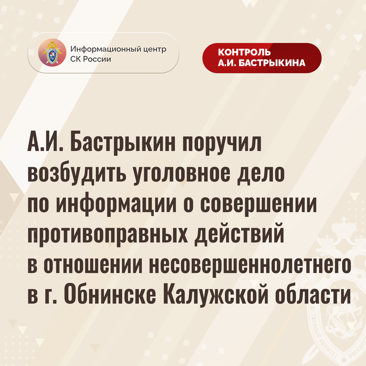 А.И. Бастрыкин поручил возбудить уголовное дело по информации о совершении противоправных действий в отношении несовершеннолетнего в г. Обнинске Калужской области В сети Интернет сообщается, что в городе Обнинске Калужской области местный житель, используя малозначительный повод, ударил 15-летнего подростка. В результате мальчик упал и получил травмы, ему потребовалась медицинская помощь. В СУ СК России по Калужской области организована процессуальная проверка. Председатель Следственного комитета Российской Федерации Александр Иванович Бастрыкин поручил и.о. руководителя СУ СК России по Калужской области Константину Игоревичу Василевичу возбудить уголовное дело и представить доклад о ходе и результатах его расследования. Исполнение поручения поставлено на контроль в центральном аппарате ведомства. #СледственныйКомитет #СКРоссии #СКР #ИЦСКР #ИнформационныйЦентр #АлександрБастрыкин #ПредседательСКР #КонтрольПредседателяСКР #КомментарийКонтроль #КалужскаяОбласть